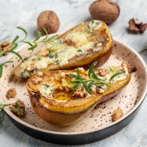 Poires rôties au fromage bleu, noix et miel